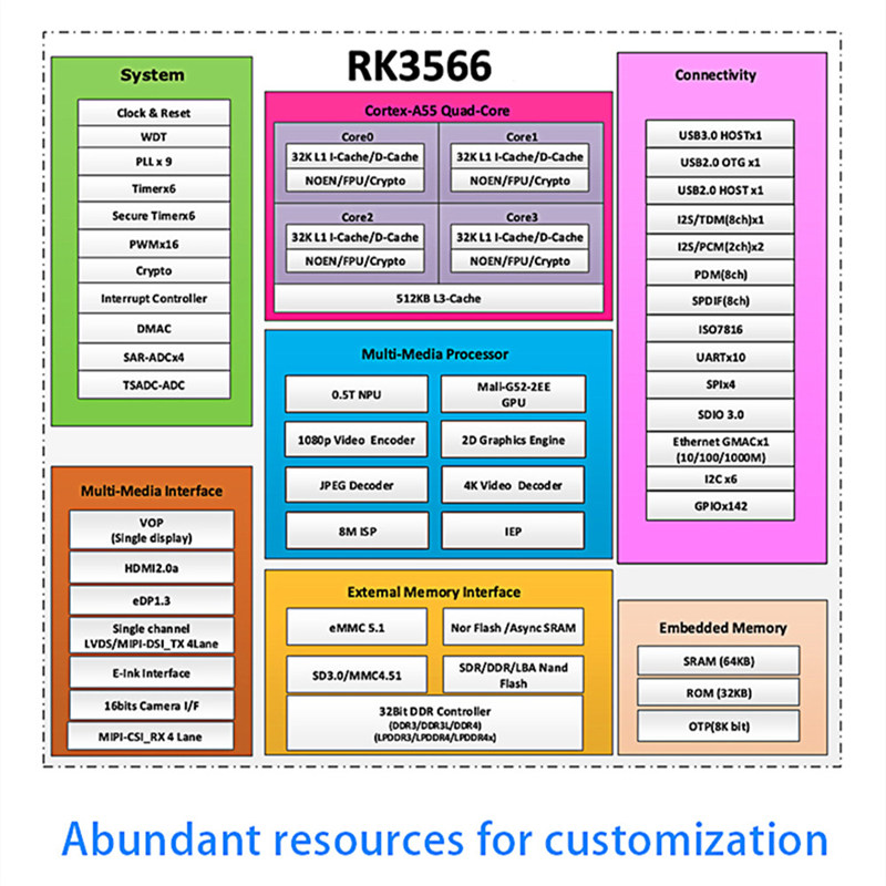 • РК3566 Доноси 22нм напредна технологија, са главном фреквенцијом до 2,0 ГХз, ЦПУ може бити опремљен капацитетом до 8 ГБ меморије, што може достићи 32-битну ширину и фреквенцију до 1600МХз.